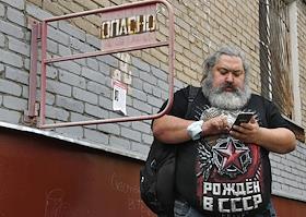 Виды Москвы. Жанровая фотография. Мужчина в футболке с надписью "Рожден в СССР" у предупреждающего…