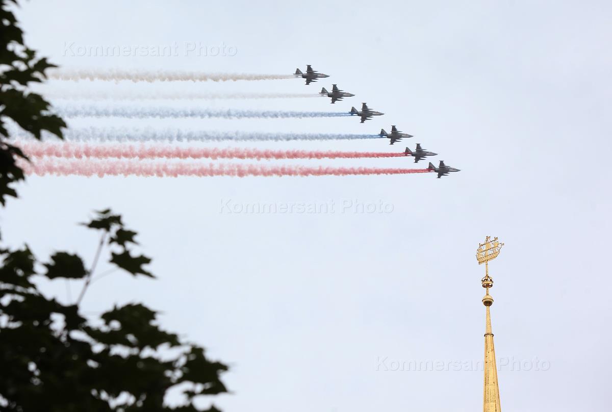 Военно-морской парад в честь Дня Военно-морского флота (ВМФ) России. Штурмовики Су-25 с дымом цветов…