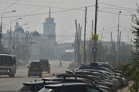 Лесные пожары в Якутии. Смог над площадью Орджоникидзе в городе.