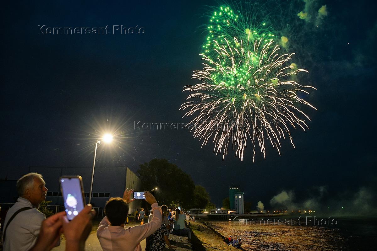 Празднование Дня Военно-морского флота (ВМФ) России. Жанровая фотография. Салют в честь дня ВМФ…