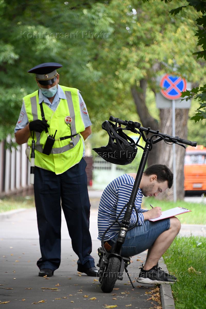 Жанровая фотография. Сотрудник ДПС во время оформления протокола с водителем самоката.