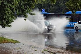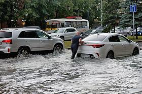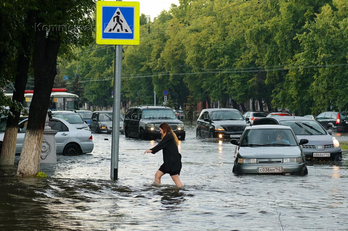 Виды Кемерово после ливня. Жанровая фотография. Автомобили и пешеходы на затопленной улице центра…