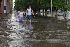 Виды Кемерово после ливня. Жанровая фотография. Пешеходы на затопленной улице центра города.