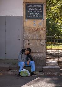 Виды Санкт-Петербурга. Жанровая фотография. Мужчина спит у входа в Клиническую инфекционную больницу…
