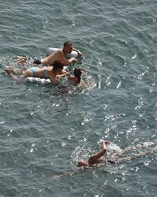 Жанровая фотография. Отдыхающие плавают в море на надувном матраце.