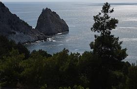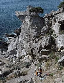 Жанровая фотография. Море и скалы у моря. Мужчина с мольбертом рисует на скале.