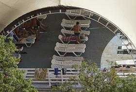 Жанровая фотография. Отдыхающие загорают на пляже под навесом.