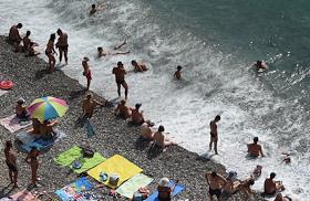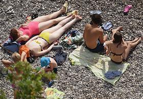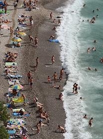 Жанровая фотография. Отдыхающие загорают на пляже у моря.