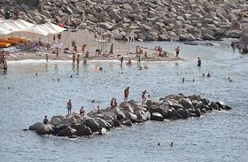 Жанровая фотография. Отдыхающие купаются в море на пляже.