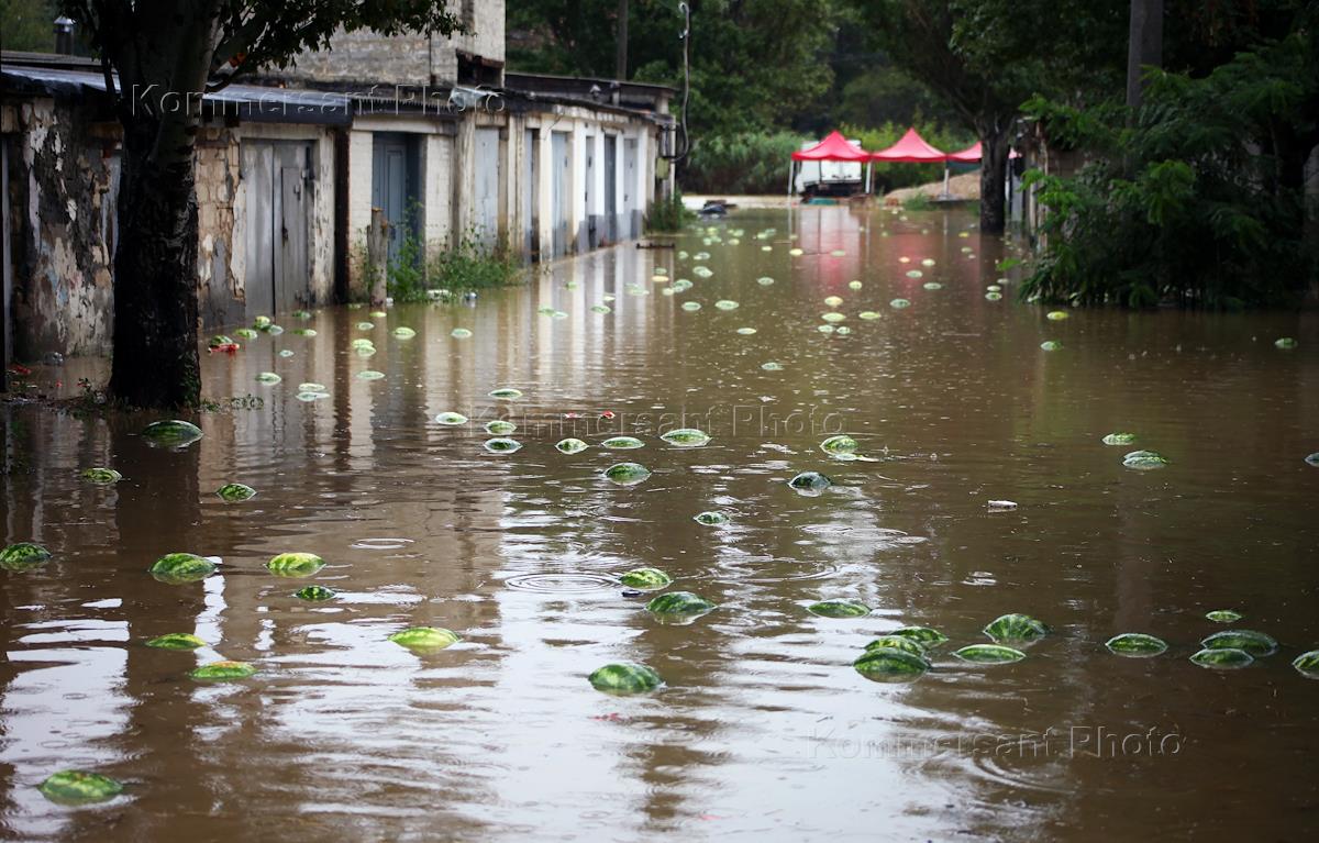 Жанровая фотография. Наводнение из-за ливневых дождей. Арбузы, плавающие в воде на дороге.