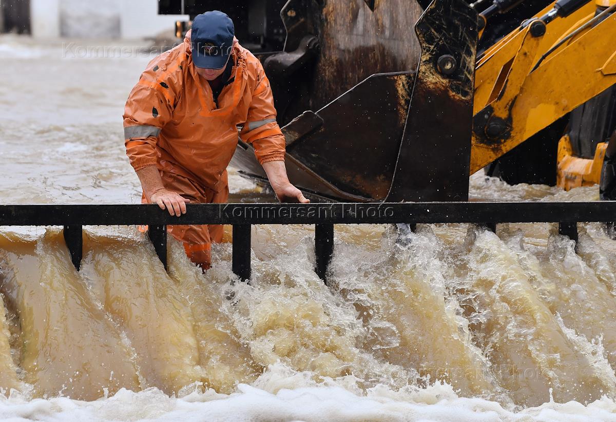 Последствия ливней в городе. Жанровая фотография. Потоки воды по улице города. Сотрудник…