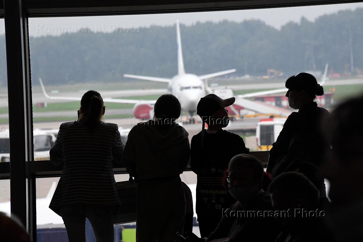 Жанровая фотография. Пассажиры в зале ожидания международного аэропорта Внуково имени А.Н. Туполева.