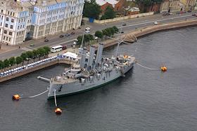Революционный Крейсер "Аврора", в котором сейчас находится музей, на набережной реки Невы. Вид из…