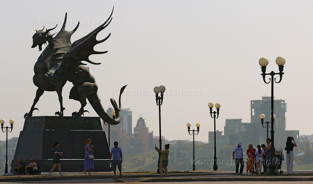 Виды Казани. Жанровая фотография. Люди гуляют в сквере у Центра семьи "Казан". Сукльптура зиланта…