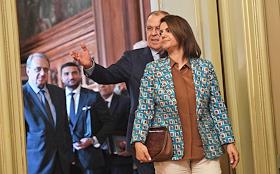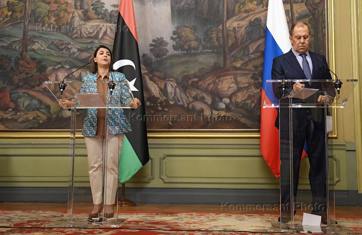 Политика Переговоры министра иностранных дел России Сергея Лаврова с министром иностранных дел и международного сотрудничества Правительства национального единства Ливии Наджлой Манкуш в Доме приемов МИД России.