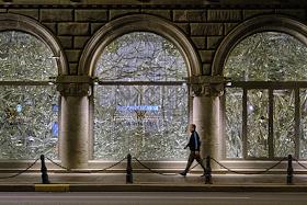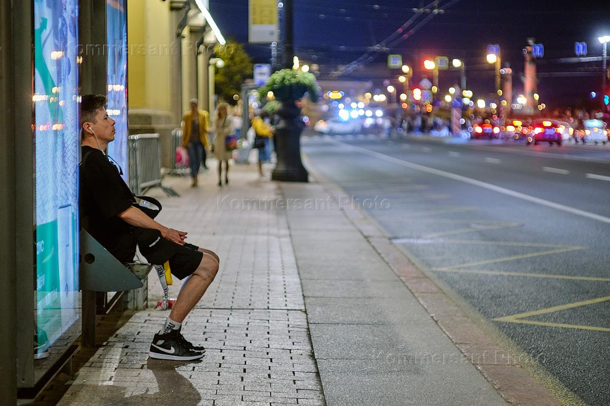 Жанровая фотография. Ночной город. Одинокий пассажир на остановке общественного транспорта.