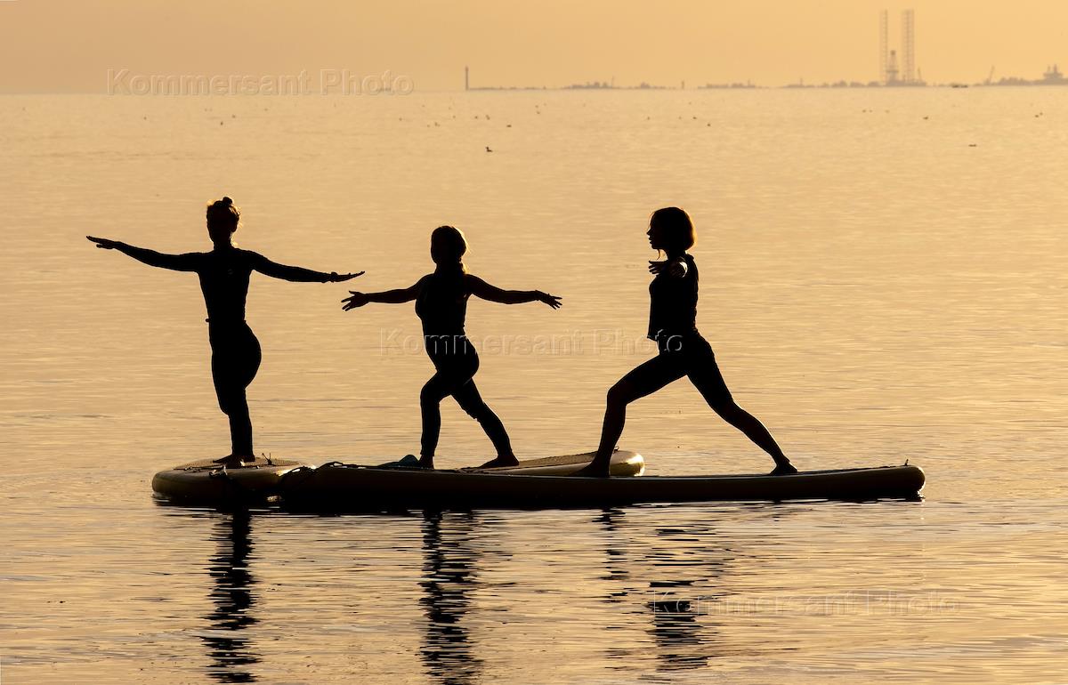 Виды вечернего Санкт-Петербурга. Жанровая фотография. Жители города занимаются йогой на сап-досках…