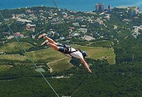 Жанровая фотография. Туристы во время прыжка на роуп–джампинг с вершины горы Ай-Петри.