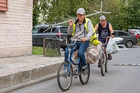 Виды Санкт-Петербурга. Рыбацкое. Жанровая фотография. Дворники на велосипедах везут вешалку.