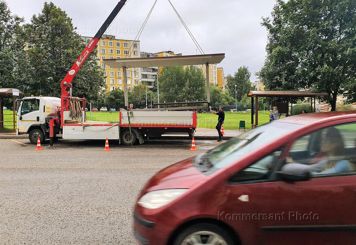 Жанровая фотография. Установка новой автобусной остановки на Новоясеневском проспекте.