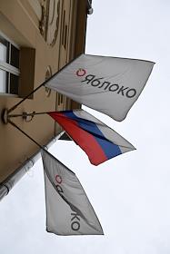 Виды Москвы. Пятницкая улица. Жанровая фотография. Флаги России и партии "Яблоко" на здании штаба…