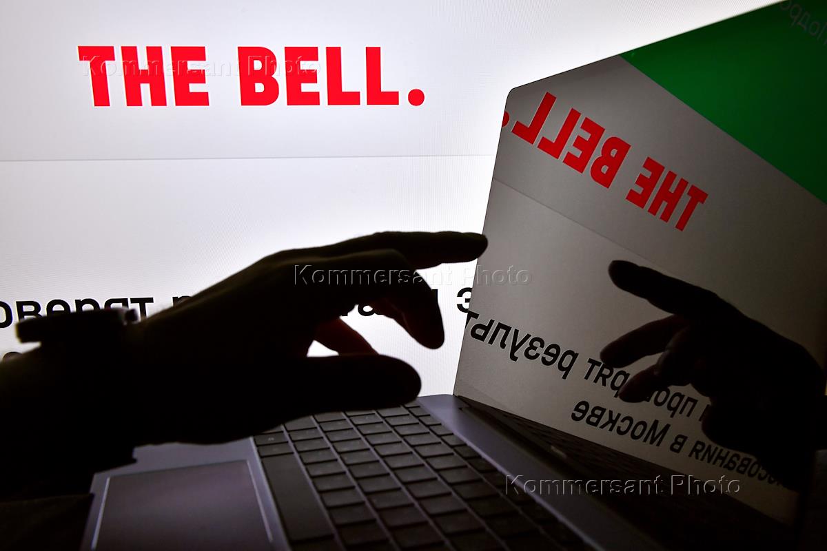 Жанровая фотография. Страница сайта издания The Bell на экране компьютера и рука над клавиатурой…