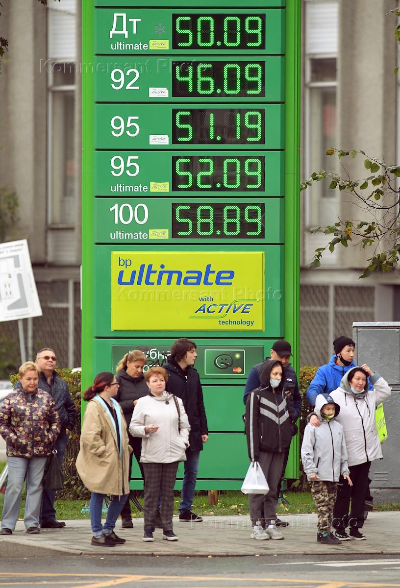 Жанровая фотография. Стелла с ценами на бензин возле остановки общественного транспорта.