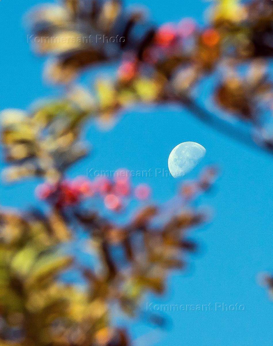 Жанровая фотография. Вид дневной луны сквозь ветку рябины.