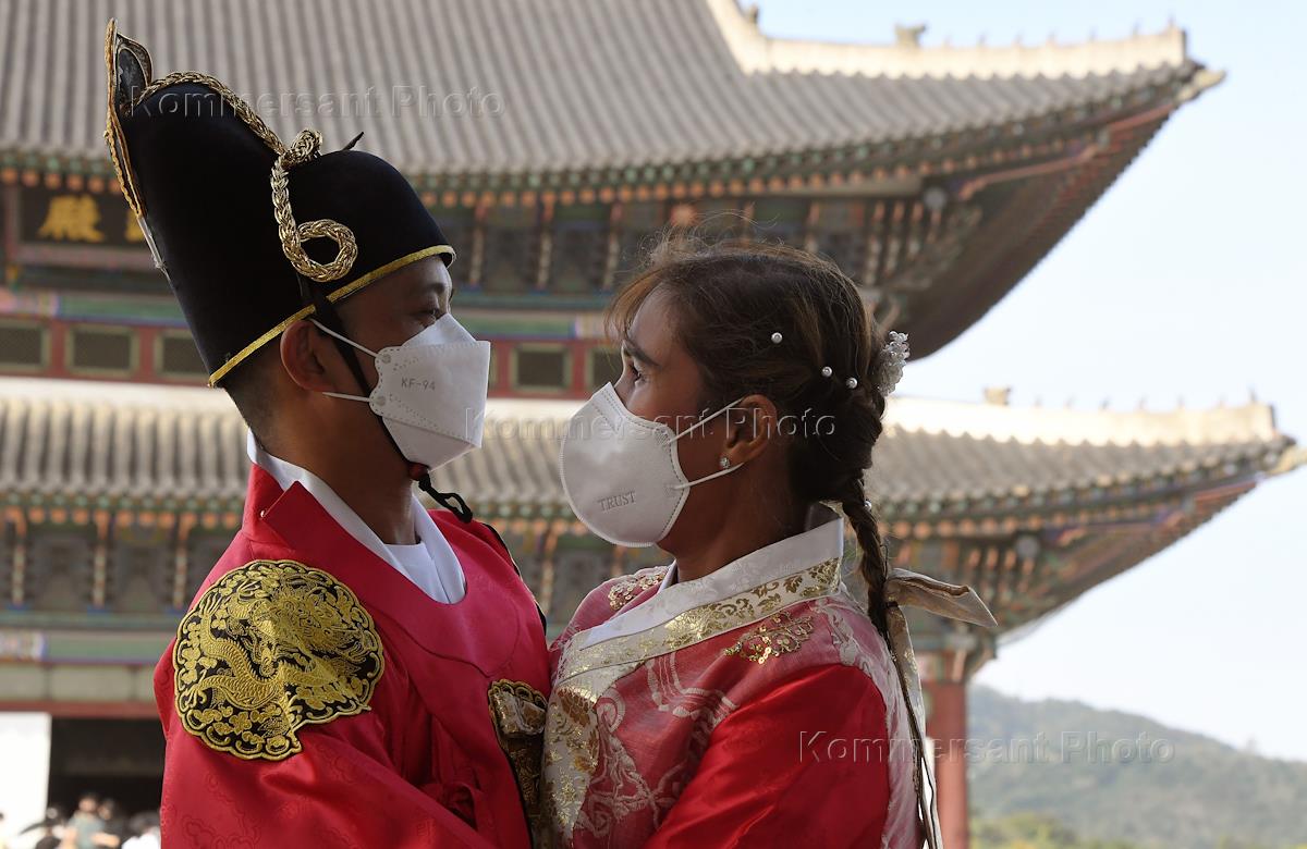 Виды Сеула. Мужчины и женщина в национальной одежде во время прогулки.