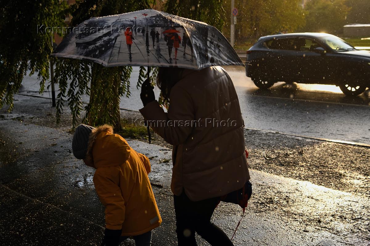 Жанровая фотография. Мама с дочкой под зонтом во время дождя с градом.