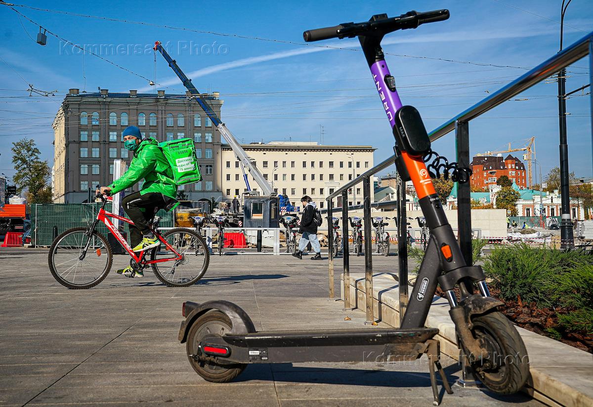 Виды Москвы. Жанровая фотография. Курьер службы доставки Delivery Club на велосипеде и…