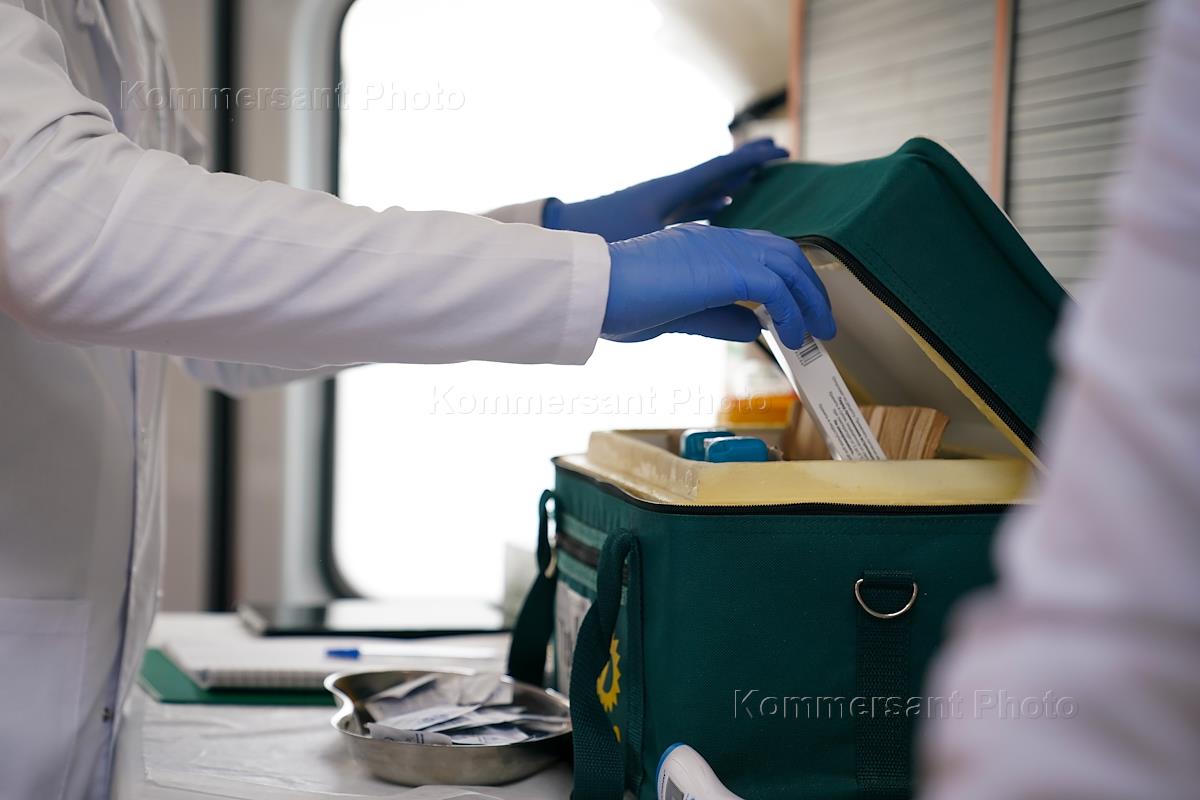 Мобильный пункт вакцинации от гриппа возле станции метро "Тверская". Пациент возле автомобиля скорой…