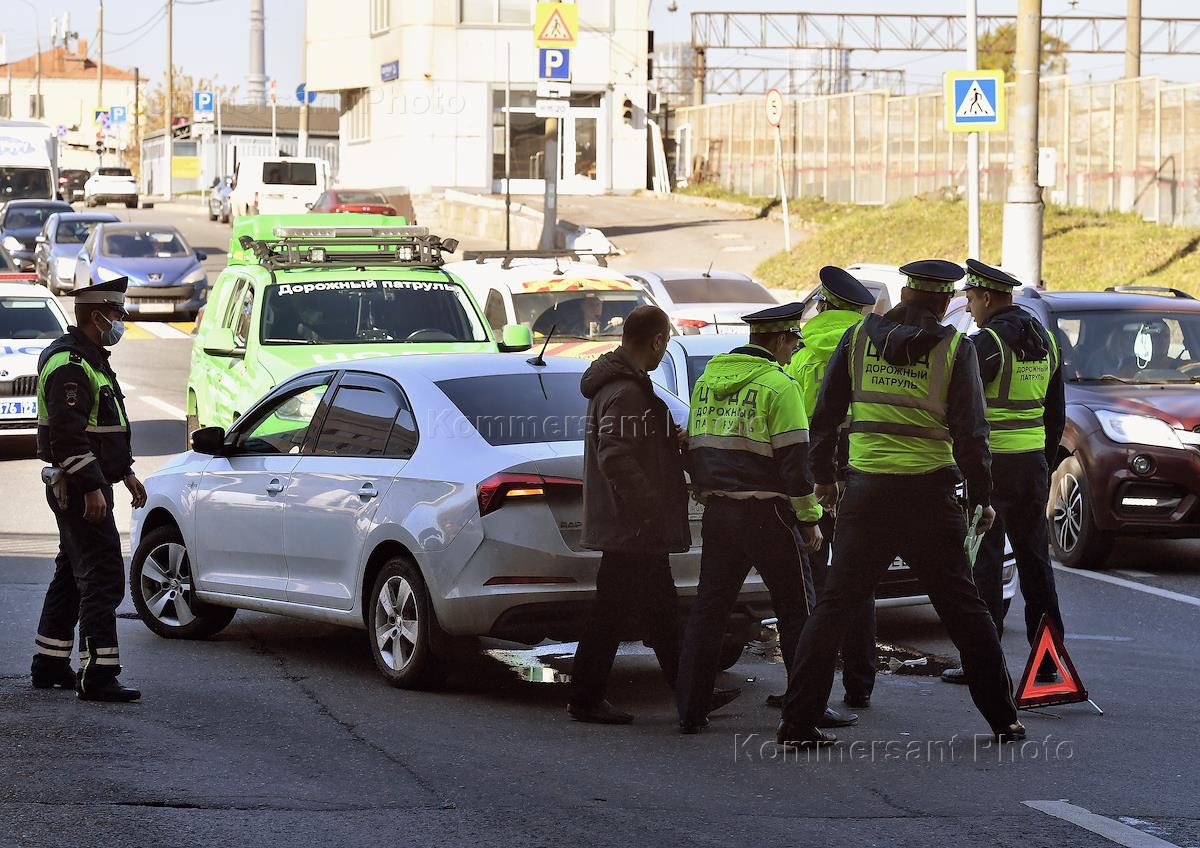 Жанровая фотография. Сотрудник Центра организации дорожного движения (ЦИДД) на месте автомобильной…