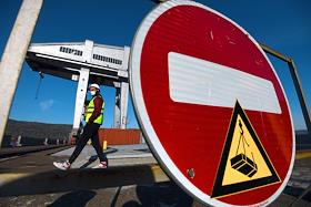 Красноярская Гидроэлектростанция (ГЭС). Жанровая фотография. Сотрудник ГЭС и знак "Проезд запрещен".