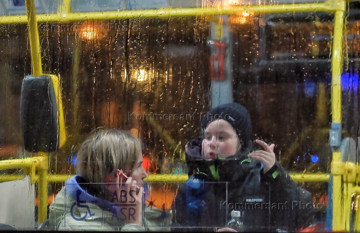Жанровая фотография. Виды Москвы. Женщина с ребенком едут в салоне городского автобуса в дождливую…