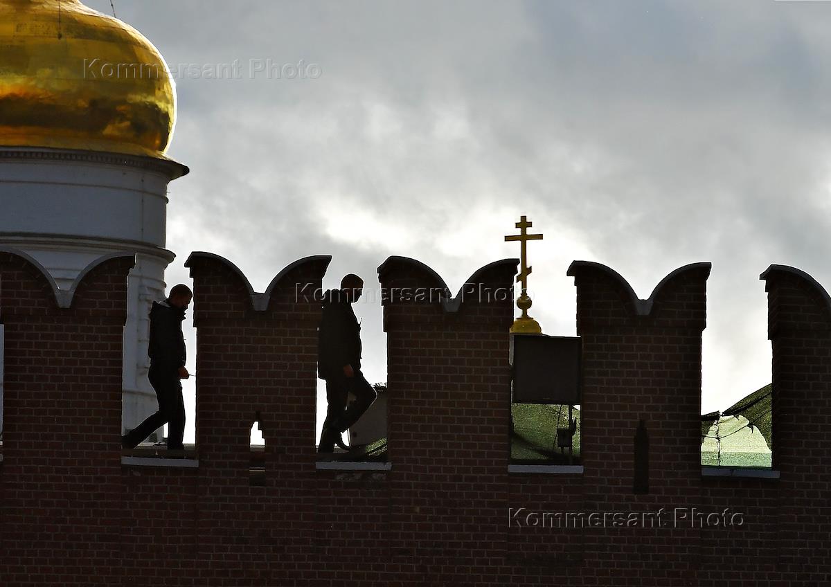 Жанровая фотография. Последствия урагана в городе на Красной площади. Поврежденные элементы (зубцы)…