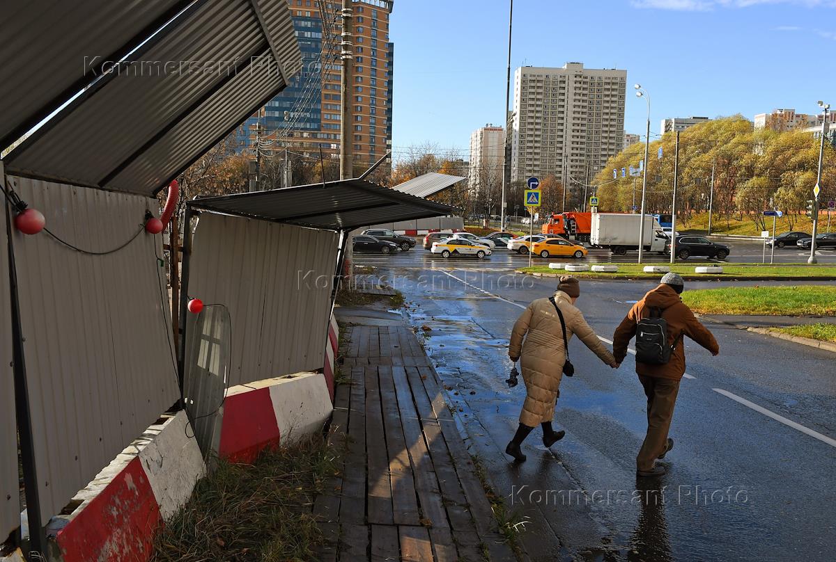 Последствия сильного ветра в Москве. Жанровая фотография. Сломанный забор строительной площадки.