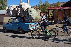 Виды Ташкента. Жанровая фотография. Легковой автомобиль с мешками на крыше на улице.