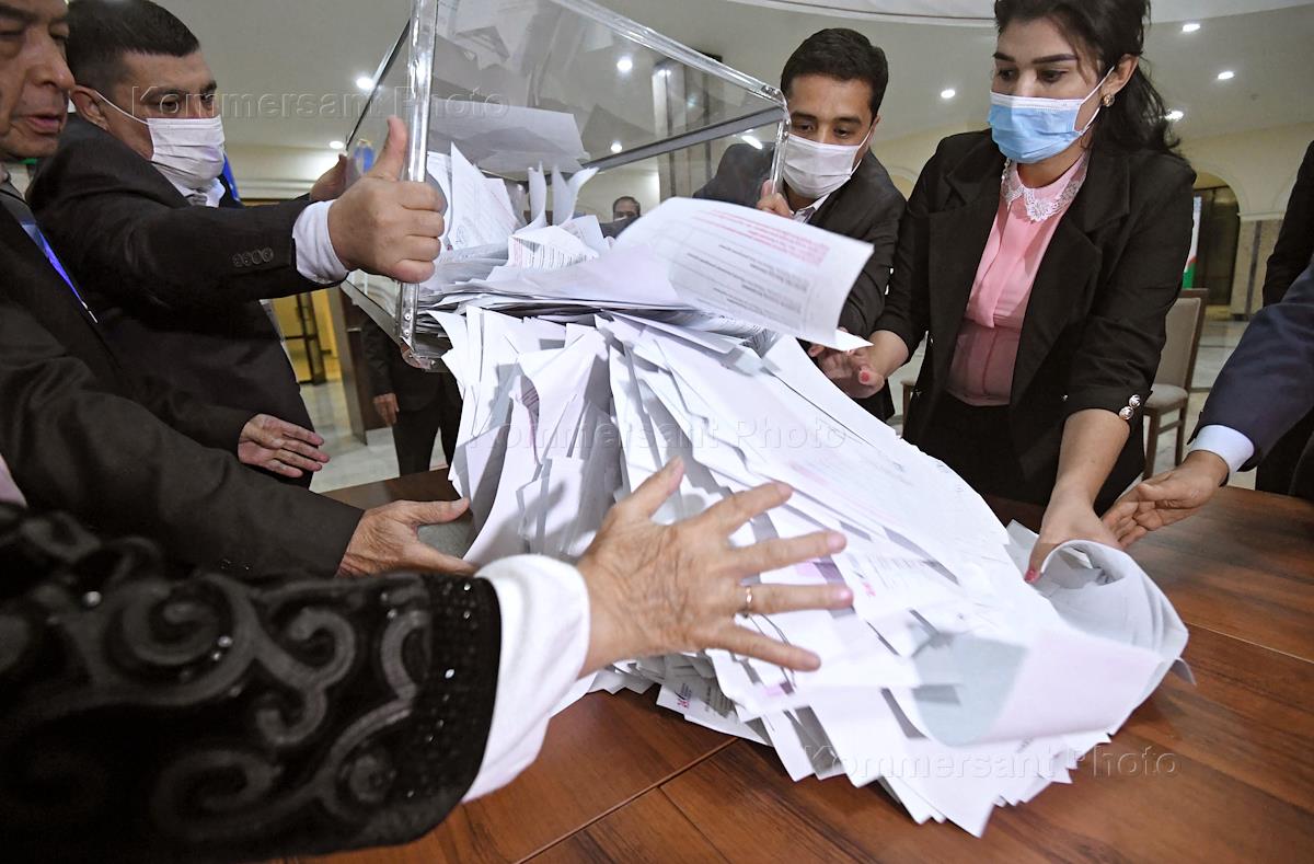 Выборы Президента в Узбекистане. Члены участковой избирательной комиссии во время подсчета…