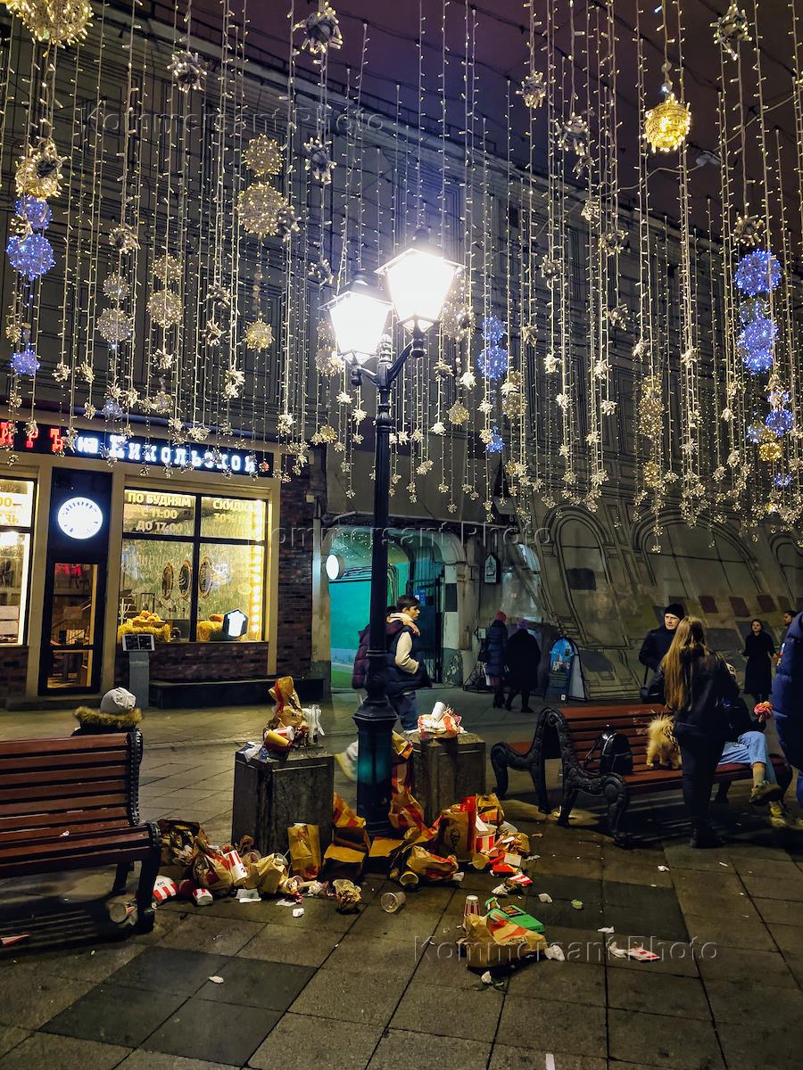 Виды Москвы. Жанровая фотография. Никольская улица. Мусор от упаковок еды ресторанов фаст-фудда.