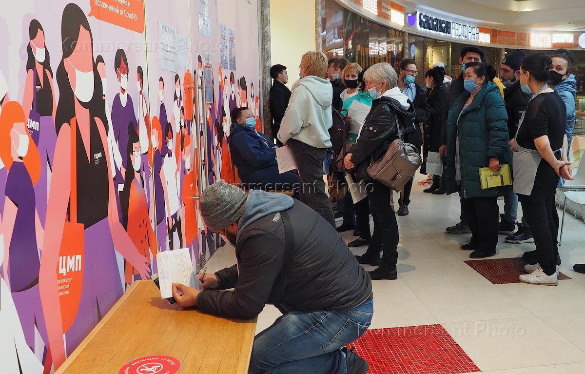 Жанровая фотография. Люди в очереди на вакцинацию от коронавирусной инфекции COVID-19 в торговом…