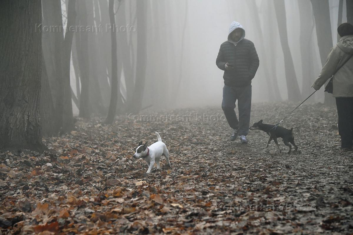 Виды Москвы во время тумана. Район Ясенево. Жанровая фотография. Мужчина гуляет с собакой в парке.