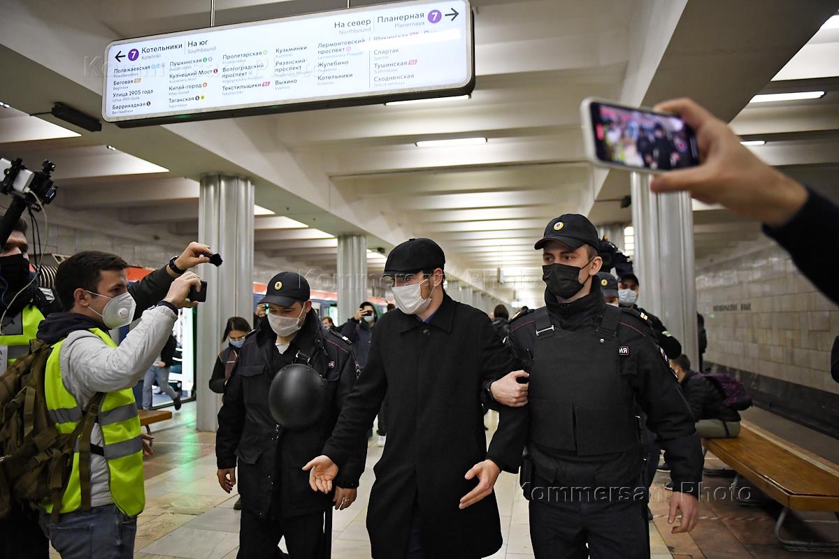 Несанкционированная акция националистов "Русский марш" на Пушкинской площади. Сотрудник полиции во…