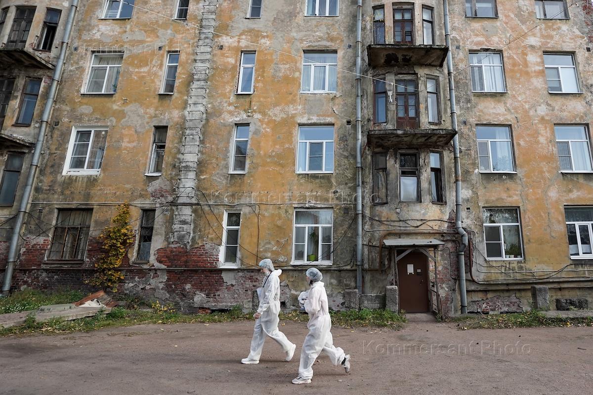 Виды Выборга. Жанровая фотография. Медицинские работники идут на вызов во дворе жилого дома.