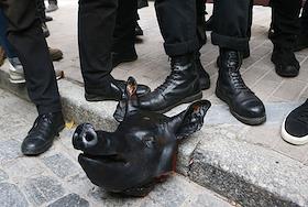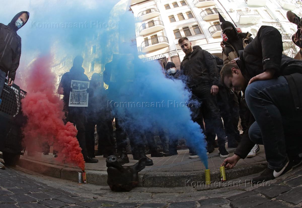 Происшествия и конфликты Участники организации "Национальное сопротивление" во время акции протеста против политики президента Белоруссии Александра Лукашенко, касающейся мигрантов на границе Белоруссия - Польша, у здания посольства Белоруссии в Киеве.
