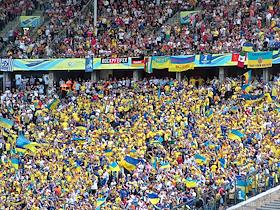 Чемпионат мира по футболу. Болельщики сборной Украины на трибуне во время матча.
