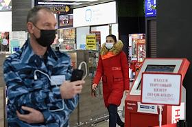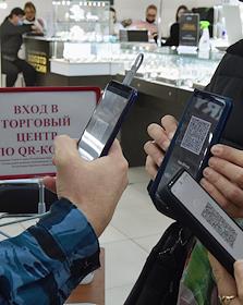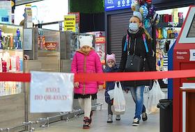 Ситуация с COVID-19 в Крыму. Жанровая фотография. Охранник сканирует QR-код покупателя при входе в…