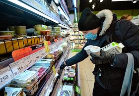 Работа магазина "ВкусВилл". Жанровая фотография. Покупатели в медицинских масках в торговом зале…
