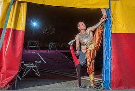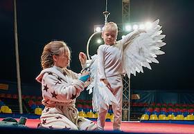 Повседневная жизнь российских цирков. Жанровая фотография. Гимнаст Цирка - Шапито вместе с маленьким…