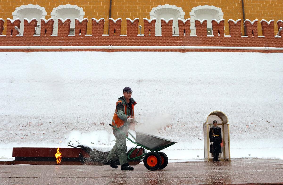 Жанровая фотография. Снегопад в городе. Сотрудники коммунальной службы города во время разбрасывания…